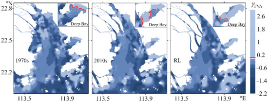 The spatial distribution pattern of FVA in the LDB remains similar, although the shoreline is changing (Figure 9). All scenarios demonstrate a predominant tendency of ebb dominance, and preform the pronounced difference between the channels and shoals. However, the differences between scenarios are limited except in some local areas, for instance, the western coast and Deep Bay. Along the western coast, the positive skewness region shrank with the land reclamation of the tidal flat from the 1970s to the 2010s, then nearly disappears in the RL scenario. Moreover, the skewness shows a different tendency in Deep Bay. The skewness of the FVA changes from negative to positive gradually, from the 1970s to the RL (Figure 9). It means the tidal current in this area is in the tendency switching from ebb dominance to flood dominance, which favors net landward sediment transport [29]. Zhang and Mao argued that human activities in Deep Bay aggravated the severe sediment deposition further [55], which agrees well with our findings here.