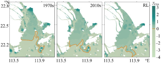Corresponding to each scenario, the locations of the main contour line ( = 0) of the FDA are compared in Figure 10. Significant shrinking of the negative area is observed along the western coast due to the land reclamation. The positive area has an obviously seaward extension: about 4 km, from the 1970s to the 2010s scenarios; and about 1.5 km between the 2010s and the RL scenarios. These changes would alter the deposition location of fine sediment. Meanwhile, there is an increase in the average skewness from 0.3 (in the 1970s) to 0.4 (in the 2010s), then to 0.5 (in the RL). It means that the stronger the convergence, the more ascendant the low water slack. In addition, the positive value of the FDA favors the landward transport of fine sediment [29].