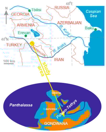 The palaeogeographical position of the study area can be derived from present interpretations of the pre-Jurassic history of the Lesser Caucasus terrane. Taking into account its relative position to the Greater Caucasus, which is thought to be a Galatian terrane [30,31], and the trajectories of the Middle Eastern blocks depicted on modern plate tectonic reconstructions [24,32,33,34,35,36,37], it appears that the Lesser Caucasus was a part of the northern (African-Arabian) Gondwanan margin until the Cimmerian terranes were detached from it in the late Palaeozoic together with the opening of the Neo-Tethys to reach the Laurasian margin in the early Mesozoic. If so, marine sedimentation in the study area can be attributed to the southern periphery of the Palaeo-Tethys Ocean, where there were also epeiric seas ingressed in Gondwana. The plate tectonic reconstructions noted above imply that the study area lied in the tropical latitudes and, most probably, in the Southern Hemisphere (Figure 1).