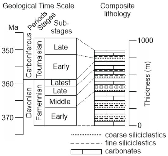 The local stratigraphical framework was characterized by Grechishnikova and Levitskii [25], Mamedov [26,27], and Rzhonsnitskaya and Mamedov [20]. The transitional Devonian–Carboniferous deposits are represented in a dozen of closely related sections and smaller outcrops, which form together the full succession of the Famennian–Tournaisian strata. These are intercalating coarse and fine siliciclastics and limestones, with different proportions in different intervals (Figure 2). The total thickness reaches 900 m. Although formations have been introduced, the deposits are usually subdivided by biozones and substages (also in individual sections—for instance, see [25]), and thus, formations are not used in the present study. These strata bear abundant fossils, including marine macroinvertebrates. Brachiopods and conodonts are especially useful to establish the age with precision and to undertake accurate zonal correlations [22,25,26,27,28]. These deposits accumulated in shelf environments, with significant flux of siliciclastic matter and under slightly changed sea level [25].