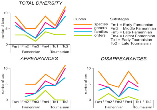 The numbers of appearances rose synchronously in the Latest Famennian (Figure 3). They dropped slightly in the Early Tournaisian and rose significantly in the second part of this stage (this did not happen with orders). The numbers of disappearances were high in the Early and Latest Famennian, but low in the Late Famennian (Figure 3). The comparison of the principal patterns implies that the mid-Famennian total diversity decline occurred due to the high number of disappearances in the Early Famennian and the lower number of appearances in the Middle and Late Famennian. The Early Tournaisian total diversity drop was driven more by the high number of disappearances in the Latest Famennian.