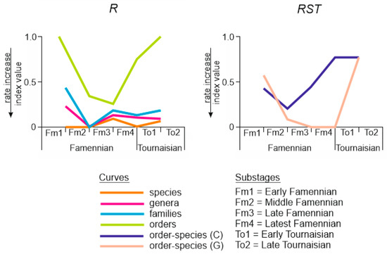 The R, RST (C), and RST (G) indices are calculated for five successive pairs of assemblages corresponding to the substages, as well as to the non-successive assemblages (Table 2). The turnovers established with R were especially strong at the Middle–Late Famennian transition (Figure 4). The assemblages changed totally (except for orders). Another strengthening of turnovers occurred at the Latest Famennian–Early Tournaisian transition, but it was less pronounced than previously for genera, families, and orders. One should also note the relatively high rate of turnovers throughout the entire considered time interval.