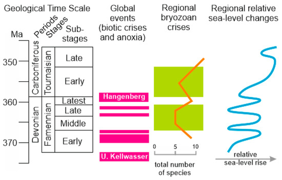 It is also necessary to pay attention to the regional palaeoenvironmental factors, namely relative sea-level changes and oxygen depletion. Sea level fluctuated in the Famennian, and trend to deepening established in the Tournaisian (Figure 5). The comparison of these fluctuations with the total diversity changes (Figure 3) indicates the absence of any clear correspondence. Moreover, it is very notable that the total generic diversity is equal in the Famennian and the Tournaisian (when calculated per stages—see above), although the sea was generally deeper in the latter. However, one may wonder whether the decline of species diversity from 26 species in the Famennian and 17 species in the Tournaisian can be linked to the noted deepening. As for anoxia, geochemical investigations are yet to be conducted in the study area. However, grey-to-black shales are noted among the Famennian deposits [25,27]. Their presence permits us to hypothesize episodes of oxygen depletion, which generally correspond to the multiple Famennian anoxic events [1]. Indeed, geochemical investigations coupled with high precision dating of potential oxygen depletion beds are necessary in the study area for their accurate correlations. However, if even the global anoxia did not leave signatures in the study area, bryozoans could be stressed by the global events. They evolved in the open sea connected to the world’s water masses (Figure 1), and thus, the global-scale collapses of fossil communities linked to anoxia and mass extinctions were able to stress organisms even where the palaeoenvironmental triggers of the stress did not “work”.
