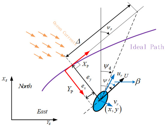 Ignoring the heave and pitching movements of USVs, the path variables are illustrated in Figure 1, where and represent the current location and the arbitrary location of the predefined path, respectively. Considering the influence of the unknown time-varying disturbances such as ocean current, we establish a 3-DOF kinematic model of the underactuated USV [21,32].