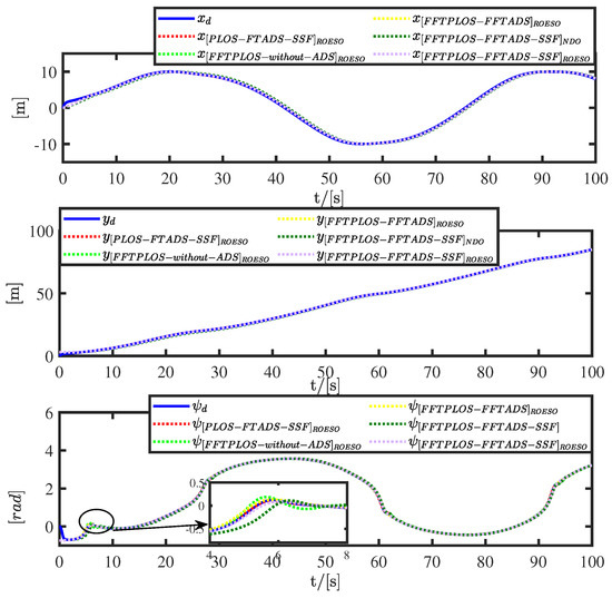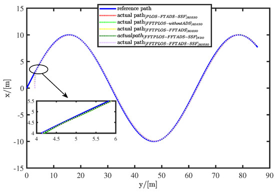The design parameters involved in FFTPLOS guidance law are as follow , , , , , , , and ; the path tracking controller parameters are , , , , , , , , , and ; the ROESO’s parameters are and ; and the parameters of FFTADS-SSF are , , , , , and . The reference path following is = ; the ideal surge speed of the USV is = 0.5 m/s, its initial position is and the time-varying disturbances are set as , and . The point of the origin of the predictor is set as 0. The predefined physical constraints of actuators are set as =1.5 N and N·m, and the other initial states are 0.