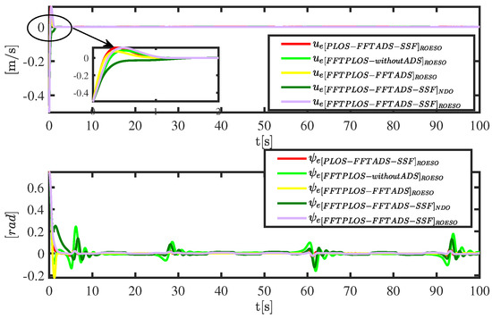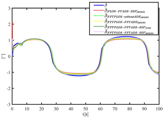 Figure 3 and Figure 4 display the performance of the path following. The FFTPLOS-FFTADS-SSF control scheme produces better-integrated performance in transient responses that is superior to others. Moreover, from the numerical table in Table 2, it is clear that the proposed scheme has smaller errors, less fluctuating and faster convergence properties than others by quantitative analysis. The overshoot of and in FFTPLOS is significantly restrained in PLOS, as shown in Figure 5. The PLOS errors and have a small range oscillatory behavior, presented in Figure 6, whereas the FFTPLOS errors and converge to zero within a finite time. Similarly, in Figure 7, by comparing with the PLOS scheme, of the FFTPLOS scheme has a slighter fluctuation and smaller deviation both in initial and tracking processes. Note that in Table 2, the IAE (the integrated absolute error, i.e., ) of estimation errors are reduced by 42.88%, 48.94%, 3.26% and 40.35% in 100 s. Furthermore, the ITAE (the integrated time absolute error, i.e., ) of estimation errors is reduced by 47.00%, 53.01%, 1.65% and 44.75% in 100 s, respectively. The quantitative analysis further shows that the proposed scheme has a more accurate sideslip compensation.