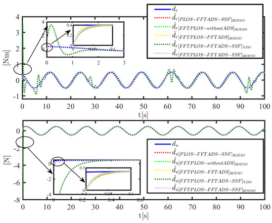 The simulation results in Figure 8 show that the ROESO in four groups perform available and effective properties for time-varying disturbances. Then, the FFTPLOS-FFTADS-SSF control scheme can estimate the time-vary disturbance at the fastest speed. The estimated time for the four control schemes FFTPLOS-FFTADS-SSF, FFTPLOS-FFTADS, FFTPLOS-without-ADS and PLOS-FFTADS-SSF increases sequentially. Qualitative analysis shows that the proposed control scheme can better estimate the external time-varying disturbance. Meanwhile, a numerical table of errors ( and ) is provided in Table 3. Compared with the other schemes, the IAE ( and ) of estimation errors of the proposed control scheme is reduced by 28.57%, 21.44%, 85.33% and 14.28% and 28.53%, 21.47%, 97.98% and 14.31% in 100 s. Meanwhile, the ITAE ( and ) of estimation errors is reduced by 28.30%, 21.45%, 78.58% and 14.31% and 28.57%, 21.42%, 97.72% and 14.30% in 100 s, respectively. The estimation accuracy of the control scheme with ROESO is much higher than that of the nonlinear disturbance observer (NDO). Quantitative analysis shows that the proposed scheme provides smaller errors, less fluctuating and faster convergence properties than the others.