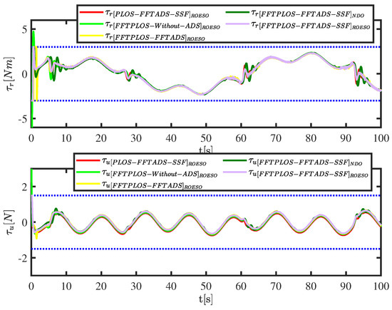 In addition, Figure 9 exhibits the control inputs, where the simulation results without input saturation (the FFTPLOS-without-ADS) are outside the prescribed limits, while the other three control schemes with auxiliary systems can limit the input signal within a reasonable range. Therefore, it is necessary to consider input saturation in the control system. Since control scheme has no auxiliary system, the system produces large fluctuations and consumption, while the novel auxiliary system proposed in this paper has smaller fluctuations.
