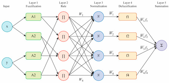The ANFIS has the most ideal structure for problem solving via learning using ANNs [36]; however, the biggest disadvantage of ANNs is that weight values are impossible to explain. The ANFIS overcomes this disadvantage using fuzzy inference [40]. Therefore, numerous studies have applied ANFIS to the sea [41,42,43]. The structure of ANFIS is shown in Figure 3.