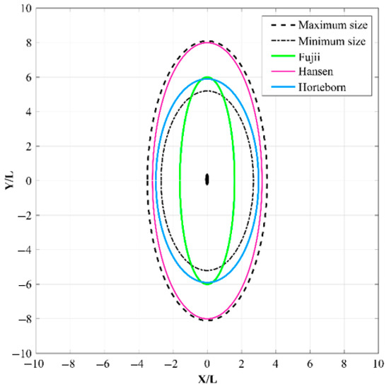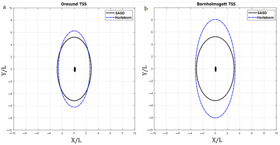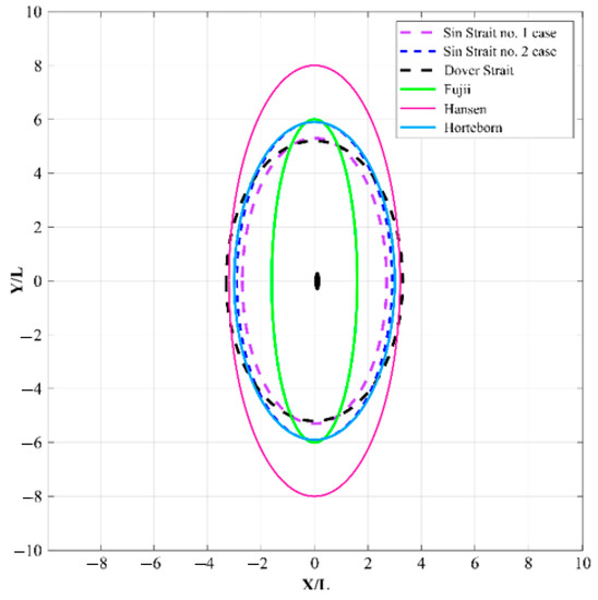 In Figure 5, the horizontal and vertical axes are expressed as dimensionless values obtained by dividing the X and Y axes by the average length of the ship (240 m) based on [29]. The red ellipse represents the largest SASD, while the blue ellipse represents the smallest SASD. At its maximum size, the major axis is 8.1 L, and the minor axis is 3.5 L. In the blue ellipse, these values are 5.2 L and 2.7 L, respectively.