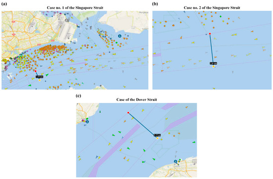 Figure 7a,b shows the Singapore Strait, with its strait width of 1.6 or 2.8 NM. In the Singapore Strait, three to four ships are often on the same route, leading to several overtaking/overtaken situations. Figure 7c shows the Dover Strait; although the passage is wider than the Singapore Strait, several crossing situations are also observed in the Dover Strait. Four ships crossing the strait in Figure 7c.