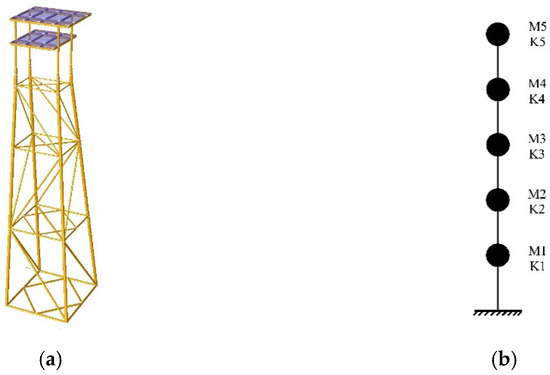 Jacket offshore platform model: (a) SACS model of jacket offshore platform; (b) simplified model of jacket offshore platform.