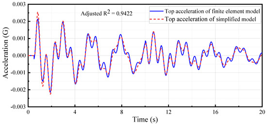 To verify the simplified model, the same dynamic load was applied to the SACS model and the simplified model to verify the effectiveness of the simplified model. As shown in Figure 2, the acceleration at the top deck of the platform calculated by the FE model and the simplified model are quite similar, which implies that the accuracy of the simplified model can be accepted.