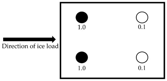 When calculating the total ice force of a multi-pile offshore platform, the shielding effect of the structure needs to be considered. The vertical leg offshore platform in this paper is a four-leg jacket-type platform without a waterproof casing. According to the direction of sea-ice action, the shielding effect is shown in Figure 3. The effective diameter coefficient of the pile leg affected by the shielding effect is 0.1.