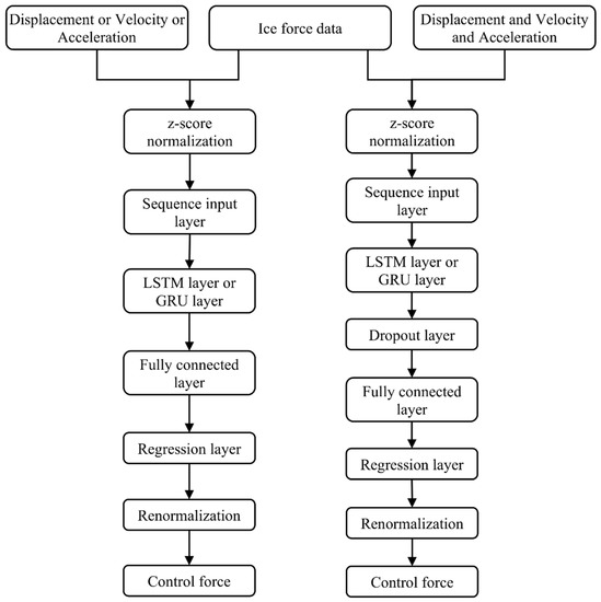 Moreover, the ice load considered in this study is simplified for computational efficiency, with the hydrodynamic effect ignored. Besides, the ice load is only applied at a specific height of the leg as a point load. Ice load applied to the deck of the platform may also cause serious damage. In the future, a more sophisticated ice force model shall be considered and the ice load shall be applied to different nodes of the offshore platform from different angles to investigate the robustness of the LSTM and the GRU-based controller.