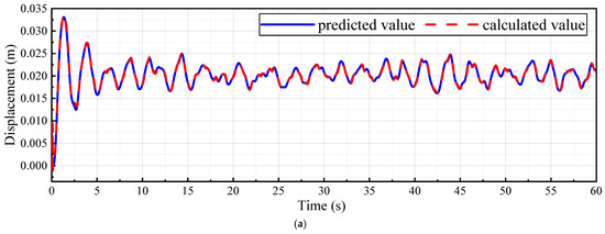 According to relevant specifications, the forecast of ice-induced vibration response of a jacket platform is analyzed when the strength of sea ice is 2.2 MPa, the thickness of ice is 40 cm and the ice speed is 0.8 m/s. The simplified model is used to calculate in the MATLAB program. First, the prediction of the GRU network will be verified that it is effective. As shown in Figure 6, the Adjusted R2 of the predicted value of displacement response was 0.9987, the Adjusted R2 of the predicted value of speed response was 0.9685, and the Adjusted R2 of the predicted value of speed response was 0.9322. It is proven that the GRU is effective at predicting ice vibration response.