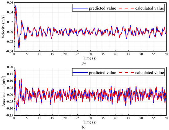 Ice-induced vibration response prediction of jacket offshore platform: (a) prediction of ice-induced vibration displacement of jacket offshore platform; (b) velocity response prediction of ice-induced vibration of jacket offshore platform; (c) acceleration response prediction of ice-induced vibration of jacket offshore platform.