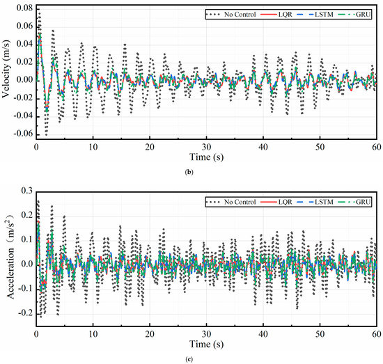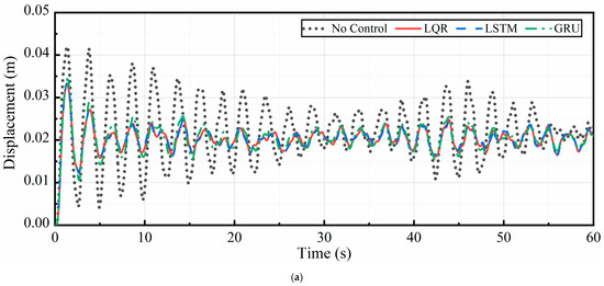 As shown in Figure 7, the LSTM control method and GRU control method proposed based on the GRU predicted response data have a good vibration control ability after learning the LQR optimal control algorithm. The control effect is shown in the following Table 5.