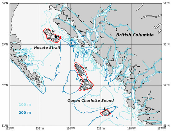 Major glass sponge reefs, estimated to be 9000 years old and considered to be the largest living example in the world, are located between Haida Gwaii and the mainland of British Columbia in Hecate Strait and Queen Charlotte Sound (HSQCS) [1]. There are three spatially distinct reef complexes: the Northern Reef, the Central Reefs, and the Southern Reef [2]. The glass sponge reefs in HSQCS are the only known sponge reefs on the rocky outcroppings of the muddy continental shelf [1] and therefore considered to be unique because glass sponges elsewhere are often on steep rocky substrates where little suspended sediment settles [3]. The glass sponge reefs in HSQCS, up to 25 m tall, discontinuously cover an area of about 1000 km2 and occur in depths of 30–200 m [2]. These reefs provide refuge, habitat, and nursery grounds for many commercially important aquatic species, for example, Pacific halibut, rockfish, and spot prawn [4,5]. Scientific surveys revealed that the glass sponge reefs in HSQCS were impacted by bottom contact fishing gear, primarily bottom trawl gear [1,4].