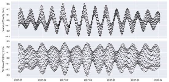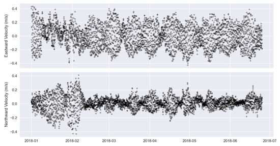 Time series of the hourly eastward and northward bottom currents at a CPZ vertex (triangle, Figure 1) of the northern reef. The currents are from [10].