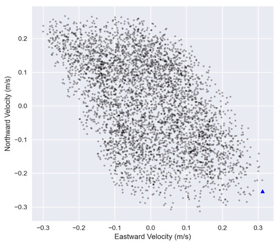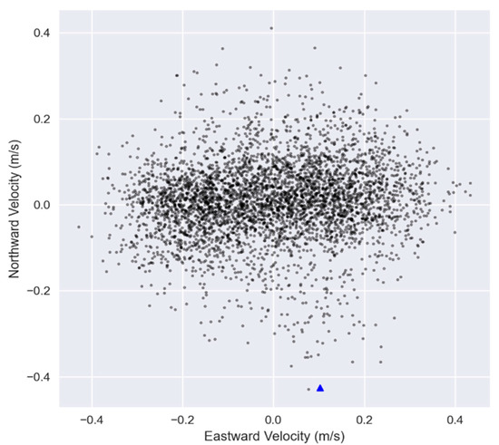 The scatter plot of the hourly model bottom currents at a CPZ vertex (triangle, Figure 1) of the northern reef for half a year. The maximum hourly current is depicted by the blue triangle.