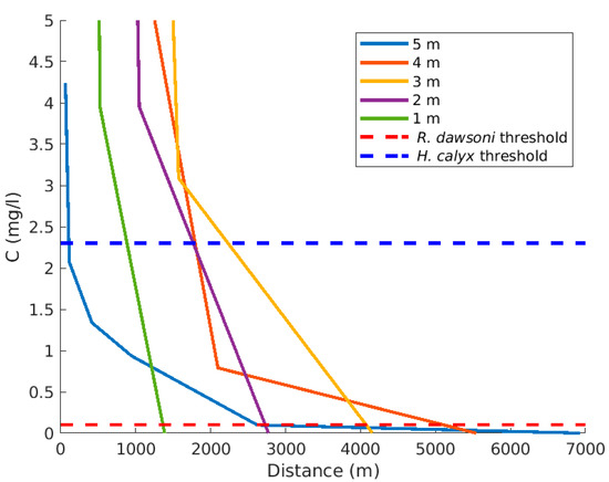 The variations of the sediment concentration with distance travelled are shown in Figure 7, for the initial concentrations of 550, 550, 430, 110, and 14 mg/L at 1, 2, 3, 4, and 5 m above the seabed, respectively. The intersection point between the sediment concentration curve and the threshold line indicates the impact distance. It can be seen from Figure 7 that sediment at 4 m above the seabed has the largest impact distance, 5.1 km, for R. dawsoni, while sediment at 3 m above the seabed has the largest impact distance, 2.3 km, for H. calyx. Therefore, we considered the impact of the sediment at 4 m only, using the effective threshold for R. dawsoni.