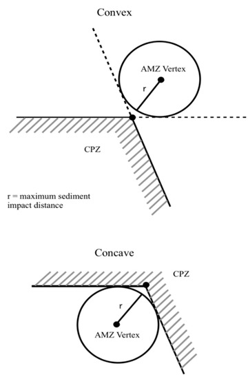 We calculated the vertices of the AMZ, which ensures that the distance from the AMZ boundary to the CPZ boundary is not less than the maximum impact distance during half a year. For a typical CPZ, there are concave and convex vertices (Figure 8). For each concave CPZ vertex, we bisected the vertex angle outside the CPZ. The centre of a circle, which has a radius of one maximum impact distance and is tangential to the two segments that intersect at the CPZ vertex, is the corresponding vertex of the AMZ. For each convex CPZ vertex, we extended the two segments that intersect at the vertex. The centre of a circle, which has a radius of one maximum impact distance and is tangential to the two extension segments, is the corresponding vertex of the AMZ.