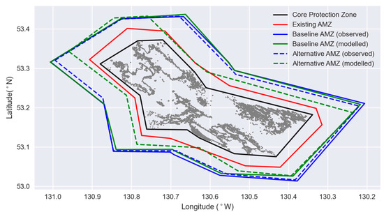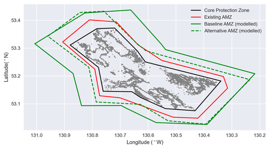 Maps are generated to show the calculated AMZs (baseline and alternative), along with the glass sponge reefs, CPZs, and existing AMZs (Figure 9). From the baseline approach using the maximum current magnitude, the distance between the proposed baseline AMZ boundary and CPZ boundary varies spatially from 3.5 to 10.0 km and, overall, is larger than that between the existing AMZ boundary and CPZ boundary (Figure 9), resulting in the increase in the proposed baseline AMZ size (Table 3) by 556 (237%) square kilometres for the northern reef. The proposed alternative AMZ from the alternative approach is also larger than the existing AMZ but to a smaller (approximately one-third) degree than the baseline AMZ (Table 3). Both the existing AMZ and the alternative AMZ are determined by considering both the magnitude and direction of the modelled currents and are therefore limited by the discrepancy in the modelled currents, as discussed in the Background section. Allowing the maximum currents to occur in any direction in the baseline approach accounts for approximately two-thirds of the increase in the baseline AMZ area over the existing AMZ area.