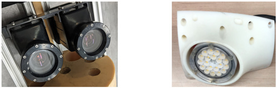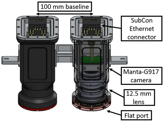 As part of the modification of the existing SPARUS II platform to enable it to provide accurate, close-to-seabed visual surveys and especially to create high-resolution (∼1 mm) 3D photomosaics of the seafloor, a stereo imaging system (Figure 2) was developed. Two 9.2 megapixel Allied Vision (https://www.alliedvision.com/, accessed on 13 May 2022) Manta-G917 cameras were selected. To avoid distortion that may be caused by the employed flat ports [33], lenses with a focal length of mm were attached to the cameras, providing a field of view of . The cameras were installed in two compact pressure-resistant housings that were designed in-house to fit the vehicle’s payload section. Each housing consists of a camera, a flat port, and a SubCon Ethernet connector. The stereo pair was installed at a baseline of 100 mm between the cameras, which is the maximum distance the payload section supports. Two high-power LED strobes were integrated within in-house designed housings. Each strobe consists of an array of 20 Cree XHP-35 LEDs, providing 30,000 lumens at 4000 k color temperature. The strobes’ beam angle was set to , fully covering the camera’s field of view (FOV). The cameras’ housing, installed inside the vehicle’s payload section, and the rear strobe, installed in the tail cone, are presented in Figure 3.