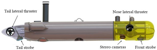 An Arduino based microcontroller was used to control the strobes’ intensity and trigger the cameras and the strobes synchronously at a frame rate of up to 10 fps. An NVIDIA (https://www.nvidia.com/, accessed on 13 May 2022) Jetson TX2 GPU was employed for image acquisition, camera control, and communication with the vehicle’s navigation system. Both the microcontroller and the GPU were installed inside the main hull and connected to the cameras and strobes through underwater cables and SubCon pluggable connectors.