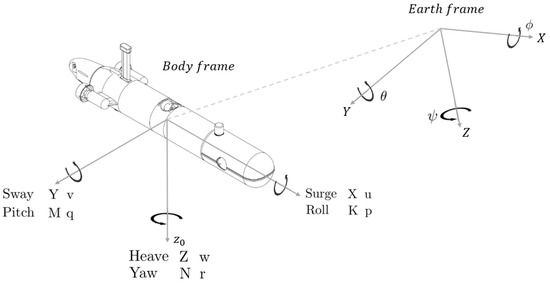 The dynamics of the vehicle are modeled according to the generalized form of the equations of a fully submerged vehicle as specified by Fossen [34]. This form employs the SNAME notation in the body-fixed frame with the origin fixed at the vehicle’s center of buoyancy, the x-axis extending along the hull axis of symmetry directing toward the nose, the y-axis directing toward the starboard side, and the z-axis directing downwards. The Earth-fixed frame employs the North–East–Down (NED) convention to describe the vehicle’s trajectory and orientation, as illustrated in Figure 5. The relation between the body-fixed and the Earth-fixed frames is given by: