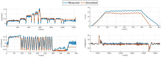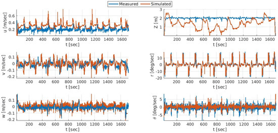 A second data set was used for the validation of the calibrated model. The data set was recorded during navigation between way-points in a lawn mower pattern at a surge velocity of 0.2 m/s and depth of 2 m. Comparison between the solution of the calibrated model and the measured dynamics, as presented in Figure 8, shows good agreement and suggests successful calibration of the dynamic model.