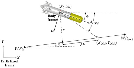 The under-actuated original configuration of the SPARUS II AUV employed the popular LOS controller [46] to follow a straight path, created by way-points. The controller computes the required heading toward an interception with a moving point on the track: