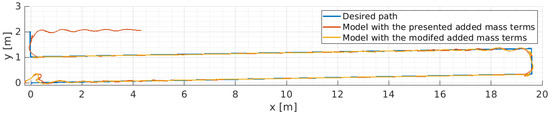 The vehicle’s motion during these trials was measured by the on-board sensors, where vehicle and sea current velocities were measured by Doppler Velocity Log (DVL). The angular rates were assessed by an inertial measurement unit (IMU) and the angles were computed by the vehicle’s angle estimator algorithm. The vehicle’s depth was measured by the pressure sensor. For the extraction of the hydrodynamic coefficients, a hybrid approach (vehicle—dynamic model) was employed. The real-time vehicle thrusters’ RPM commands as recorded in the sea trials were fed as input to Equation (12) and the obtained solutions (i.e., computed trajectories) were compared with the real ones as recorded during the sea trials.