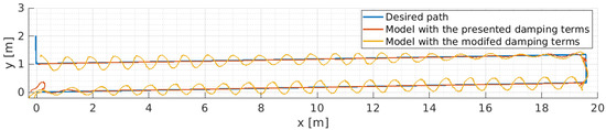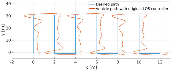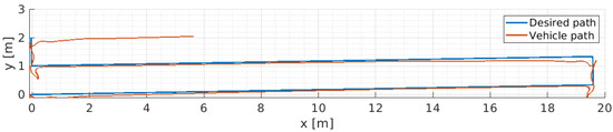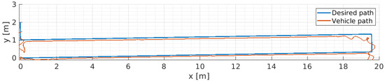 and implemented in the MATLAB-SIMULINK (https://www.mathworks.com/products/simulink.html, accessed on 13 May 2022) environment, solving for the input , where is solved by numeric integration of and the vehicle’s trajectory and orientation, referenced to the Earth-fixed frame, are obtained by numeric integration of Equation (2).