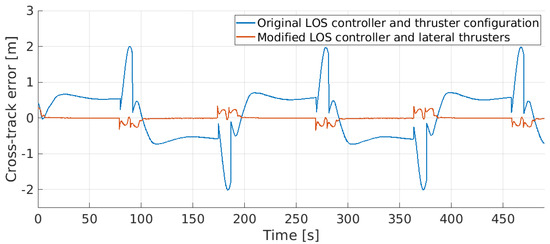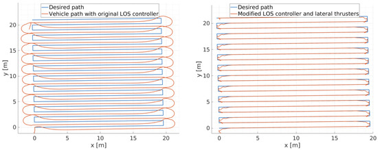 The results of the experiment performed with ALICE present small cross-track (∼0.1 m) and heading (∼) errors in addition to fast convergence to the path while the SPARUS II configuration presents high cross-track (∼ m) and heading (∼) errors as well as slow convergence to the path.