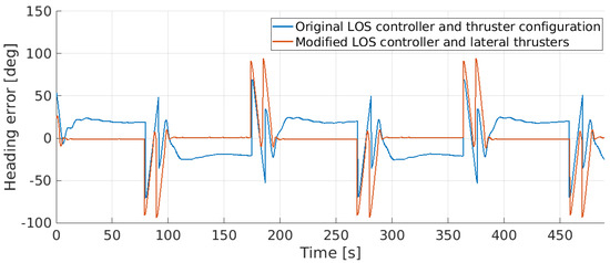 The recorded path (Figure 26, left) and heading (Figure 27) of the SPARUS II configuration present slow convergence to the path with a mean cross-track error of m. This result demonstrates the inability of this configuration to follow the targeted path with the desired precision while maintaining the heading aligned with the direction of the path. With the ALICE configuration, the recorded path (Figure 26, center) and heading (Figure 28) demonstrate precise path following along the imaging transects with a mean cross-track error of m. In addition, a comparison between the vehicle’s roll angles as recorded with the SPARUS II configuration (Figure 29) to the roll angles as recorded with the ALICE configuration (Figure 30) shows an improvement in the roll stability where the roll angles during the horizontal turns decreased from 20–30 to less than .