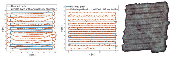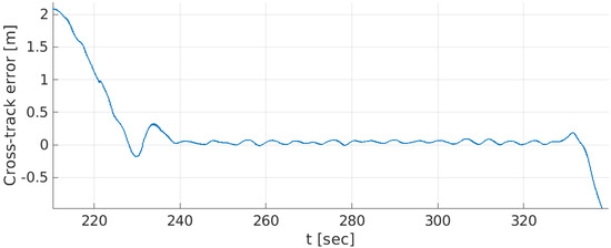 where are the vehicle’s coordinates and are the coordinates of the moving point of interception determined by the look-ahead distance, , as illustrated in Figure 9. Ideally, the cross-track error e will converge to zero and the vehicle’s heading will converge to the direction of the path . When lateral disturbances such as cross-current are present, lateral drift is avoided by steering the vehicle at a side-slip angle. This method, however, results in an undesired heading and may result in poor path following due to slow response by the indirect motion control. This behavior impairs the vehicle’s capability to accurately follow the imaging transects.