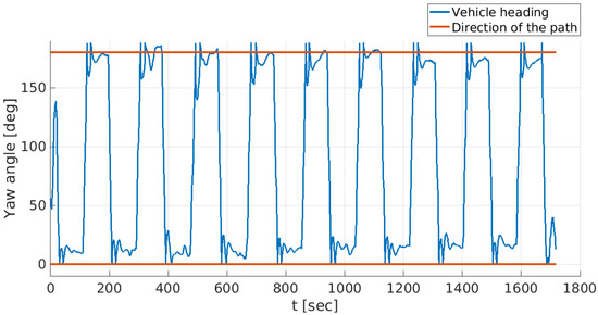 Vehicle’s heading during the mission, employing the SPARUS II configuration. The direction of the survey transects was defined from/to North to/from South (0–180).