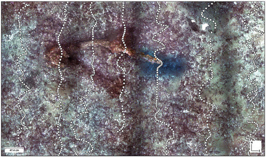 Close-up of the mosaic in Figure 26, right, acquired at Achziv, along the northern section of Israel’s Mediterranean coast. It depicts a part of a shipwreck lying a rocky reef. The AUV’s path is depicted using white dots.