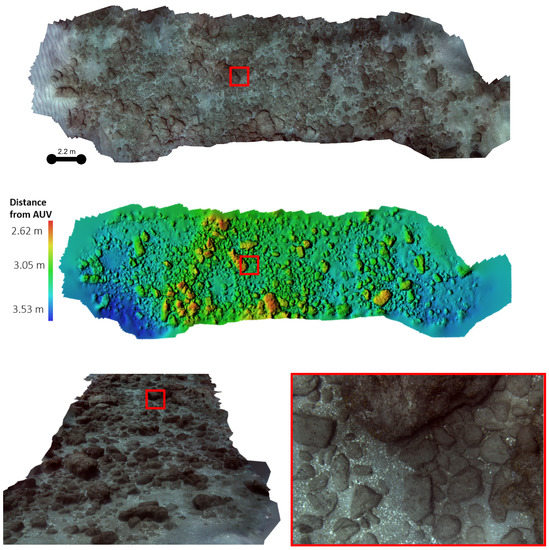 3D mosaic of a Roman underwater harbor, in Caesarea, Israel. (Top) Mosaic of an area of 8 m × 27 m; (Middle) 3D reconstruction of the same area; (Bottom left) another viewpoint of the reconstructed 3D; (Bottom right) zoom-in of an area marked with a red rectangle in the top mosaic. Full model can be viewed in https://sketchfab.com/3d-models/caesarea-roman-underwater-harbour-da2ca77fcf6141bb8e1261fb6f1d1187, accessed on 13 May 2022.
