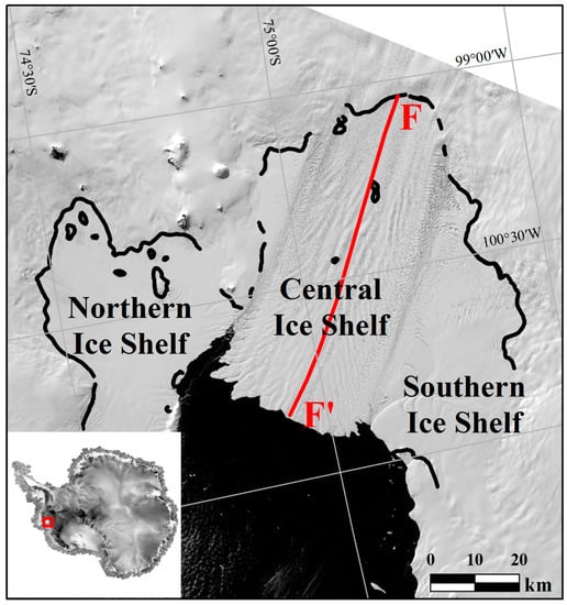 PIGIS is located at 75° S, 101° W, flowing into Pine Island Bay, Amundsen Sea, West Antarctica. Figure 1 shows the extent of PIGIS bounded by the grounding line of 2011 [,,]. The whole ice shelf is divided into three parts: the central ice shelf, the northern ice shelf, and the southern ice shelf. The central ice shelf moves much faster than the northern and southern ice shelves []. Our research focused on the central ice shelf and its surrounding shear margins.