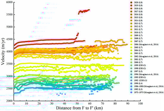 The ice flow velocity profiles along F-F’ from 1973 to 2020. Velocities of 1973–1975, 1986–1988, 1996, 2002, and 2006 were retrieved via NSIDC [,].