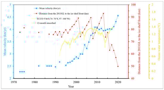 Early on, scientists pointed out that relatively warm CDW from the southern Pacific Ocean had caused basal melting of PIGIS [,]. To investigate the relationship between ice flow velocity, ice shelf disintegration, and ocean water temperature, we simulated the ocean water temperature near PIG from 1992 to 2017 by using the model ECCO-V4r4 (the orange line in Figure 3). Figure 3 shows that changes in ice flow velocity were well linked to the ocean water temperature, and there was a good correlation between them. When the seawater warmed up, it increased the basal melting and thinned the ice shelf [,]; thus, the ice flow accelerated (e.g., during 1995–2010). When the seawater temperature decreased, the ice flow slowed down (e.g., during 2010–2014).
