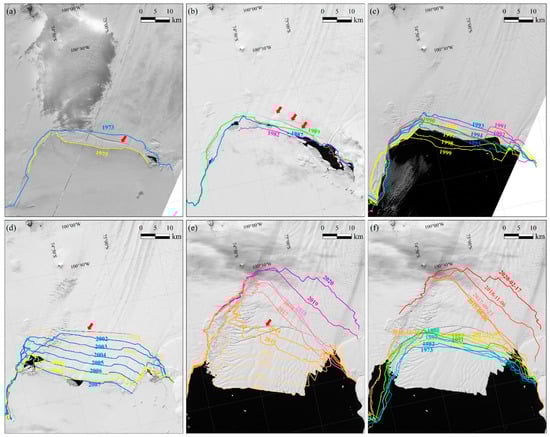 Time series of PIGIS fronts from 1973 to 2020. (a) 1970s, (b) 1980s, (c) 1990s, (d) 2000s, (e) 2010s, and 2020, (f) fronts in the most recent period after the ice shelf collapsed. Background images are: (a) Landsat-2 MSS, acquired on 13 February 1975, (b) Landsat-5 TM, acquired on 21 December 1986), (c) Landsat-5 TM, acquired on 4 February 1997, (d) Landsat-7 ETM+, acquired on 4 January 2001, (e,f) gap-filled Landsat-7 ETM+, acquired on 14 January 2013.