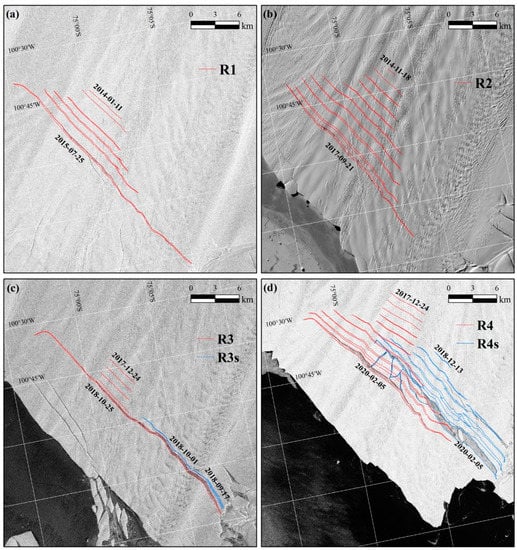 The development of the four rifts. (a) The evolution of R1 (background image: Sentinel-1A intensity image acquired on 25 July 2015), (b) the evolution of R2 (background image: Landsat-8 OLI image acquired on 21 September 2017), (c) the evolution of R3 and R3s (background image: Sentinel-1A intensity image acquired on 25 October 2018), (d) the evolution of R4 and R4s (background image: Sentinel-1A intensity image acquired on 5 February 2020).