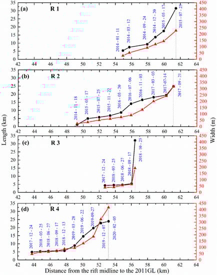 Times series records of four rifts in length and width. (a) Changes in length and width of R1, (b) changes in length and width of R2, (c) changes in length and width of R3, (d) changes in length and width of R4. The black dashed lines show the location of the rift right before calving.