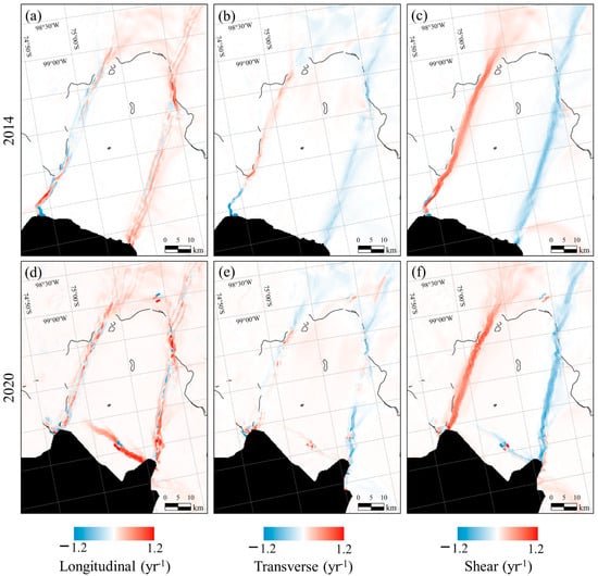 Transverse strain occurs under the action of longitudinal stress. A positive transverse strain rate indicates the divergence of the ice flow, whereas a negative value indicates the convergence of the ice flow. The shear margin areas with negative transverse strain rate indicate additional ice inflowed into the central ice shelf (Figure 7b,e). At the northern shear margin parts, positive transverse strain rate in 2014 (Figure 7b) gradually changed to a negative rate in 2020 (Figure 7e), which showed more ice inflow, and was consistent with the increase in ice flow velocity at that margin area. The shear strain rate maps have both positive and negative values, which refer to ice deformations with right-lateral movement that have a positive shear strain value []. A high shear strain rate magnitude illustrates that velocity changed rapidly across the shear zones. In Figure 7c,f, the magnitudes of the shear strain rate along the shear zones were over 0.5 yr−1, whereas the values of the central ice shelf were less than 0.01 yr−1, indicating that lateral drag along the shear margins can form crevasses.