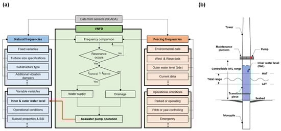 The systematic logic of VNFD is shown in Figure 1a and the theoretical configuration is shown in Figure 1b. The VNFD system is designed such that it compares the natural frequency () with the forcing frequency () and, whenever the natural frequency is lower than the forcing frequency, seawater is supplied to the inside of the substructure and, whenever the natural frequency is greater than the forcing frequency, the seawater inside the substructure is drained out. The process of calculating natural frequency and forcing frequency can be achieved using the SCADA system, but other methods can also be used in the actual application because it is difficult to post-process the vibration data every time it is required. The inside of the monopile corresponding to the height of the seabed can be assumed to be filled with soil, so it is assumed that the bed equal to the height of the seabed is also present inside the substructure. Therefore, the controllable IWL range is from the seabed to the platform height. Generally, the inside of the transition piece contains some seawater due to the diameter gap of the two tubular steels when grouting. However, sea water may infiltrate by seal leakage related to the bottom outlet of the substructure wall and J-tube and, as a result, tidal changes may occur inside the foundation [9]. Therefore, unless additional measures are taken, an internal coating of steel may be required for the intended operation of the VNFD, and treatment for sealing may be required. Also, since hydrostatic pressure is applied to the tubular steel as much as the difference between the external water level and the inner water level, this must be considered when applying this technology.