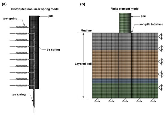 Soil-pile interaction of (a) distributed nonlinear spring model and (b) FE model.